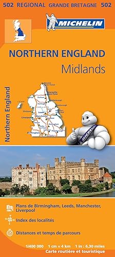 Carte routière n° 502 - Angleterre Nord & Midlands / Michelin ~ Carte détaillée du nord et du centre de l'Angleterre éditée par Michelin, qui s'étend jusqu'à Birmingham et Coventry au sud. Distances indiquées sur la carte, tableau des distances et des temps de parcours, plus index des villes inclus. Plans de Birmingham, Leeds, Manchester et Liverpool également fournis. Légende mult